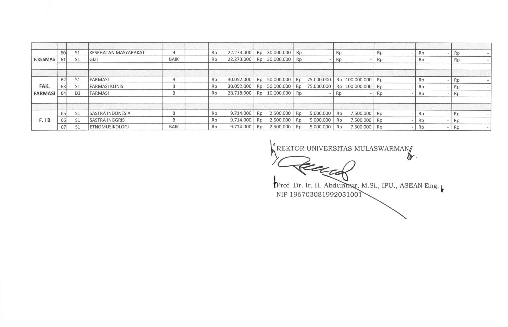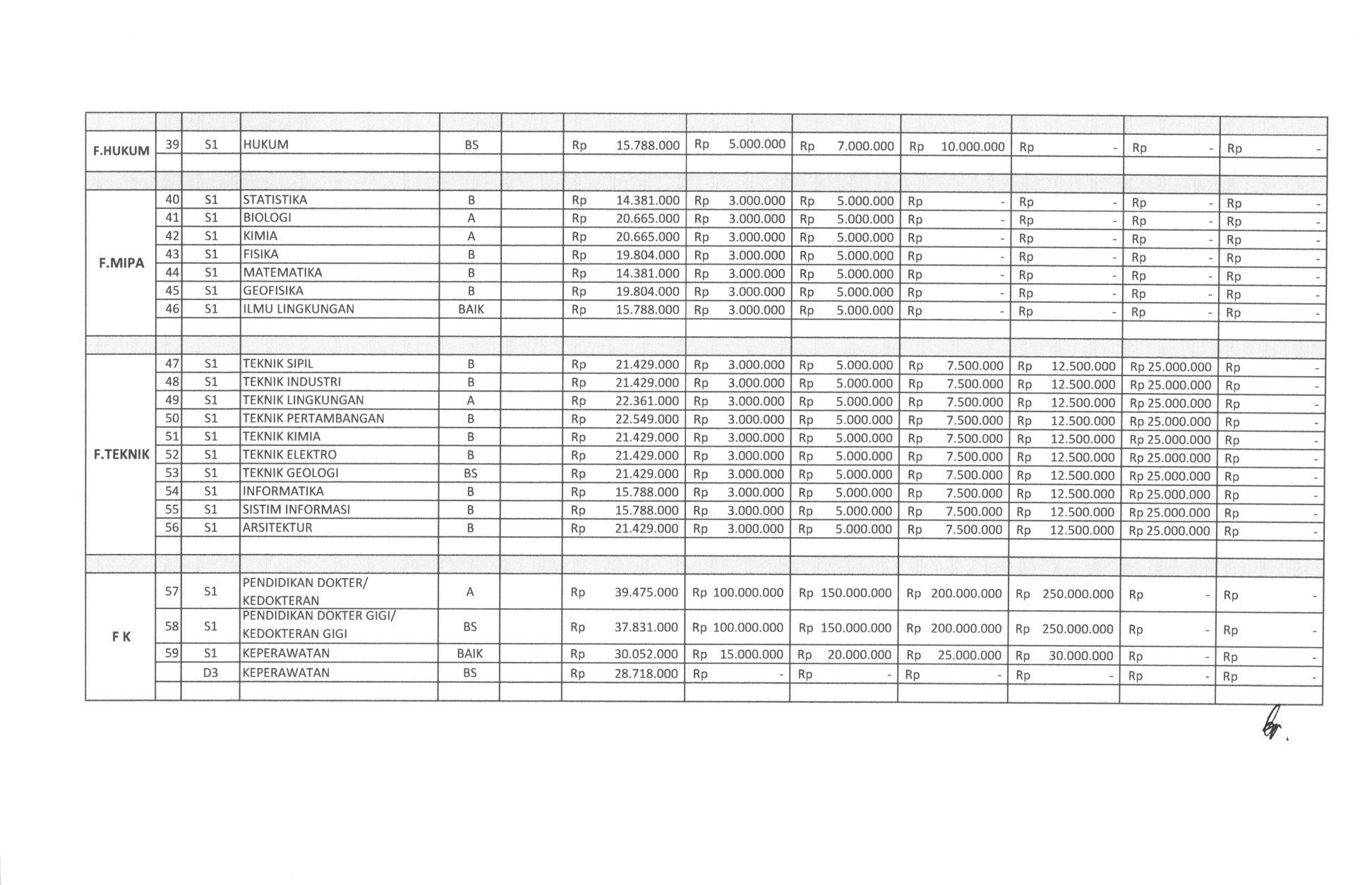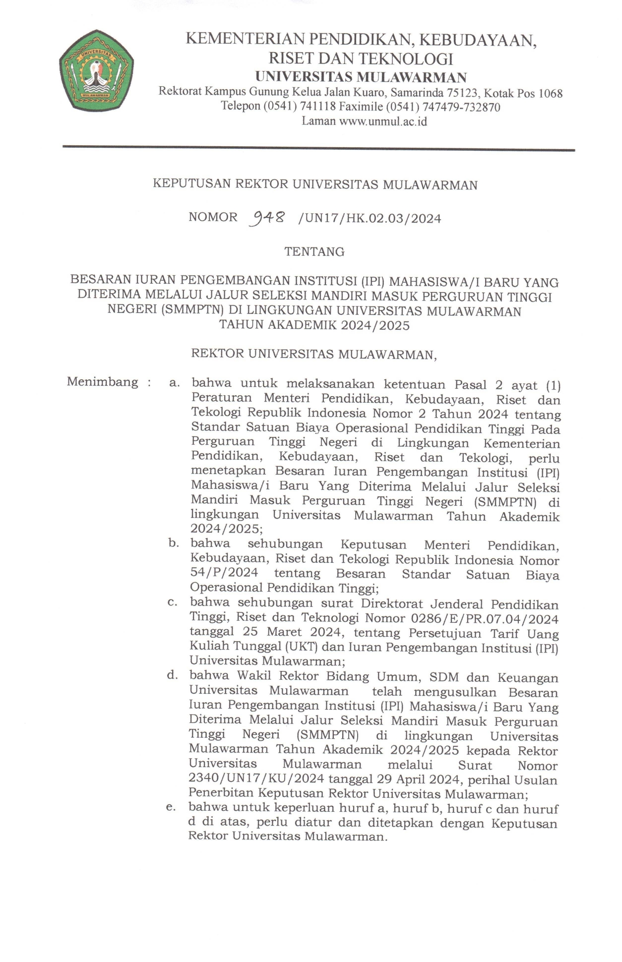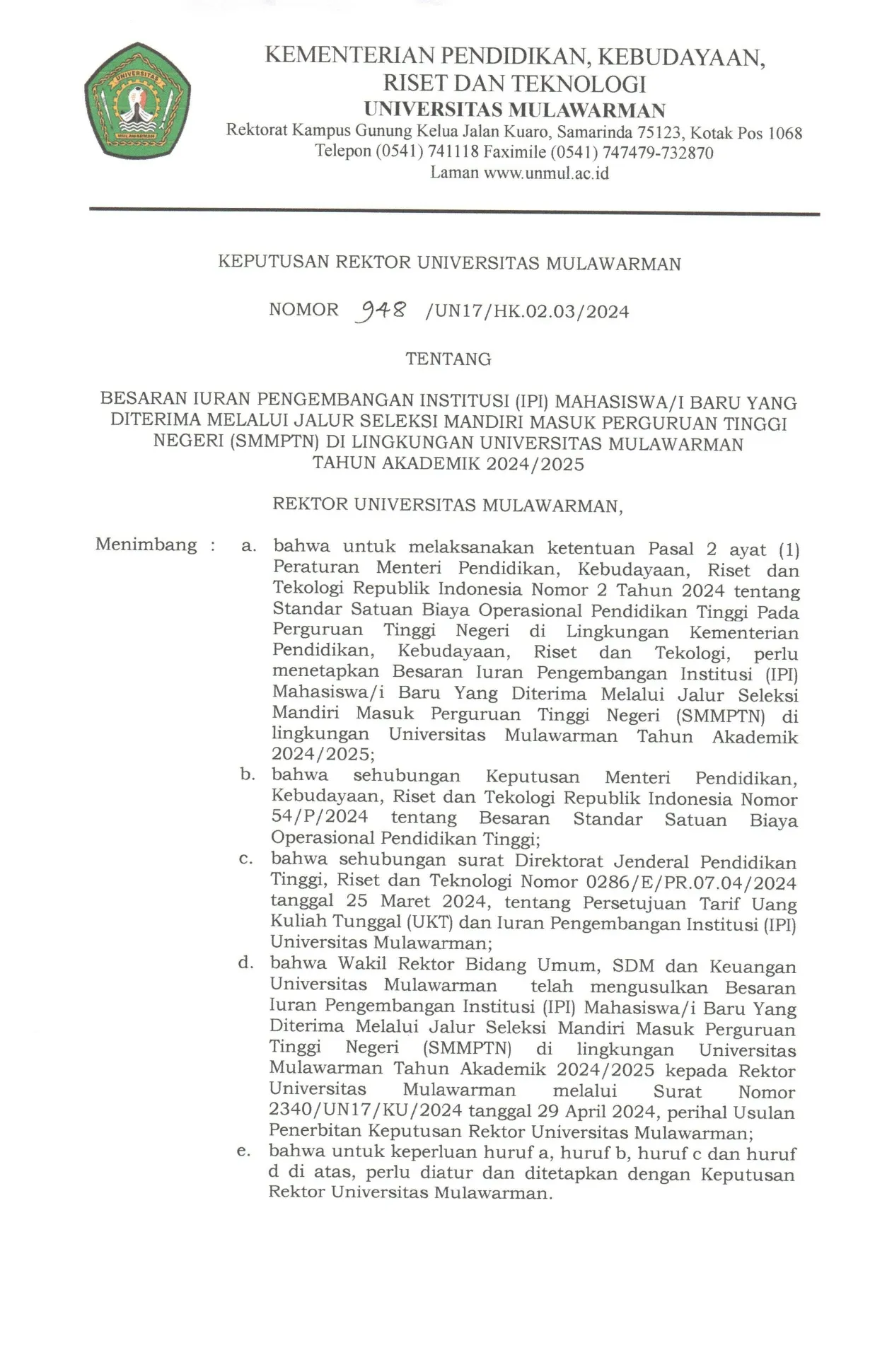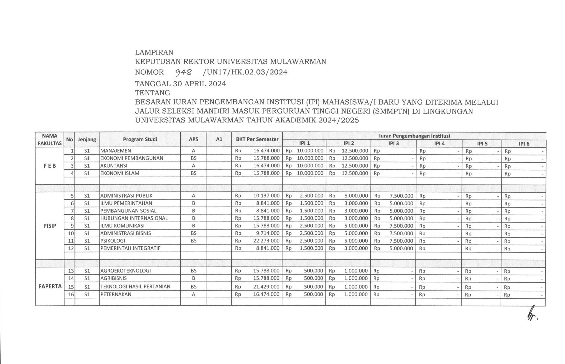 Besaran Iuran Pengembangan Institusi (IPI) mahasiswa/i Baru yang diterima melalui jalur mandi (SMMPTN) tahun 2024/2025