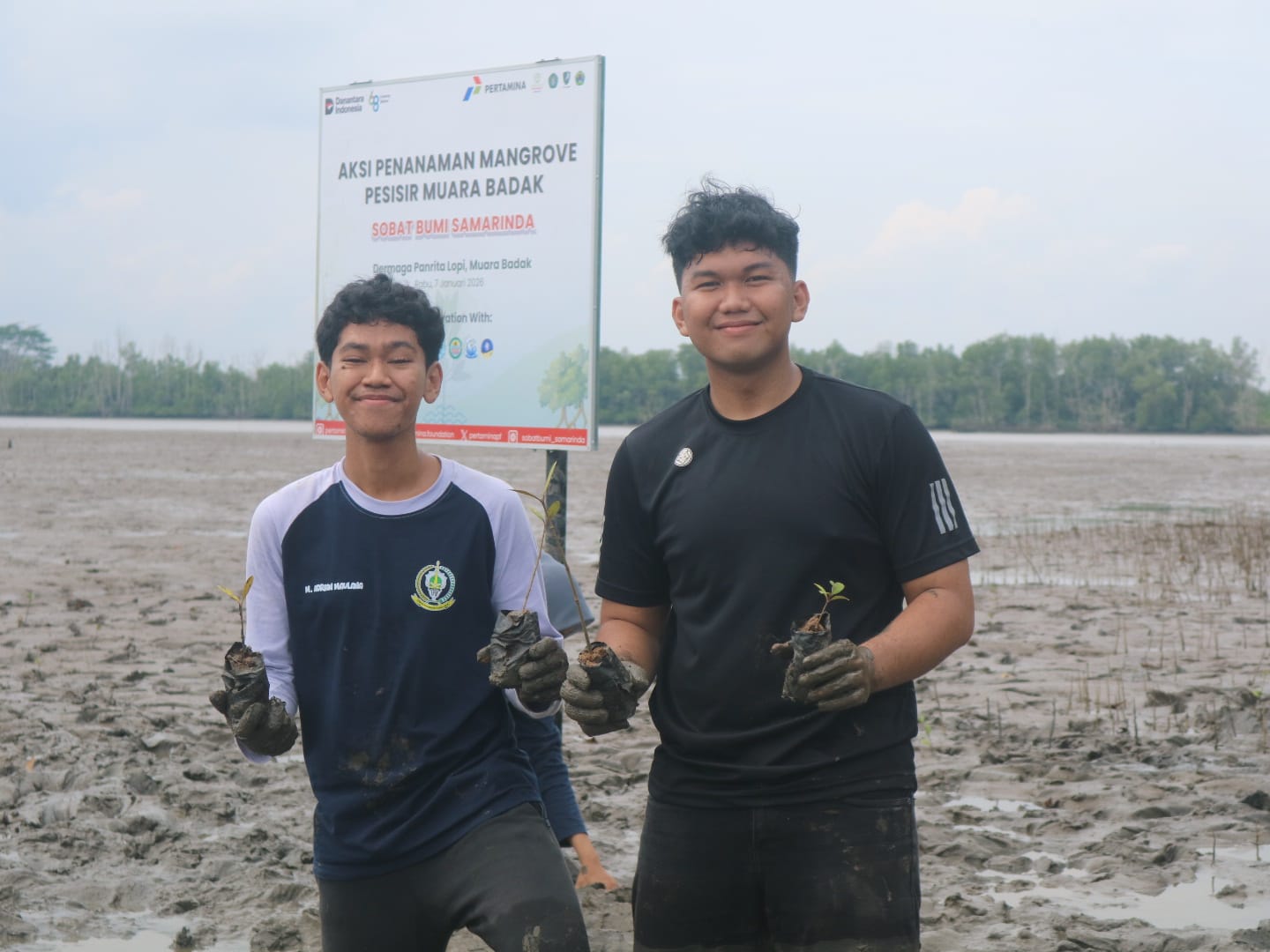 Kegiatan kedua dari Aksi Sobat Bumi Samarinda adalah aksi menanam pohon mangrove yang dilaksanakan di Dermaga Panrita Lopi, Muara Badak pada hari Rabu (7/1/2026). Kegiatan ini melibatkan mahasiswa, komunitas lingkungan, serta masyarakat setempat sebagai bentuk aksi sukarelawan nyata dalam rehabilitasi ekosistem pesisir. Penanaman mangrove dipilih sebagai langkah mitigasi bencana berbasis alam yang berfungsi menahan abrasi sekaligus menjaga keseimbangan ekosistem pesisir.