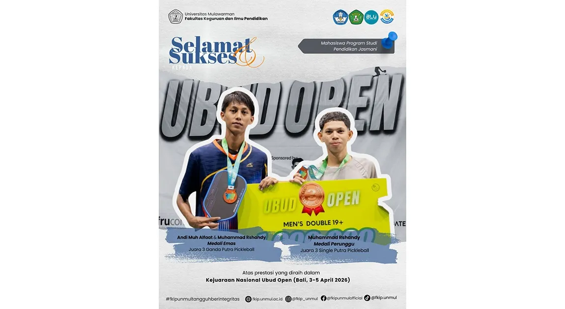 Fakultas Keguruan dan Ilmu Pendidikan (FKIP) Universitas Mulawarman (UNMUL) kembali menorehkan prestasi membanggakan di bidang olahraga. Kali ini, apresiasi tinggi datang dari Dekan FKIP UNMUL atas keberhasilan mahasiswa Program Studi (Prodi) Pendidikan Jasmani (Penjas) yang sukses membawa pulang medali dalam ajang kejuaraan cabang olahraga Pickleball dalam Kejuaraan Nasional Ubud Open di Bali dari tanggal 3 hingga 5 April 2026.