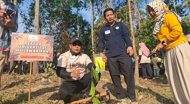 Rektor juga menyampaikan ucapan terima kasih dan apresiasi khusus disampaikan kepada Wakil Rektor III, para dekan (FKLT, Faperta, FISIP, FKIP, Farmasi, dan FMIPA UNMUL), beserta seluruh jajaran, dosen, dan mahasiswa atas dukungan dan partisipasi nyata mereka dalam penanaman pohon kopi liberika ini.