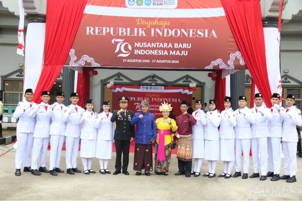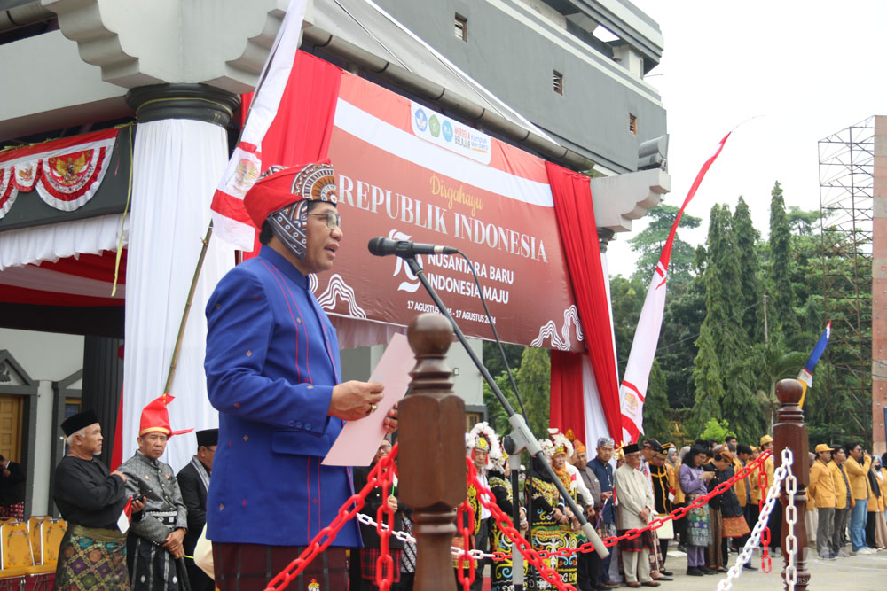 Prof. Lambang Subagiyo dalam amanatnya membacakan sambutan Menteri Pendidikan, Kebudayaan, Riset dan Teknologi (Mendikbudristek), Nadiem Anwar Makarim untuk peringatan HUT ke-79 Kemerdekaan RI tahun 2024.