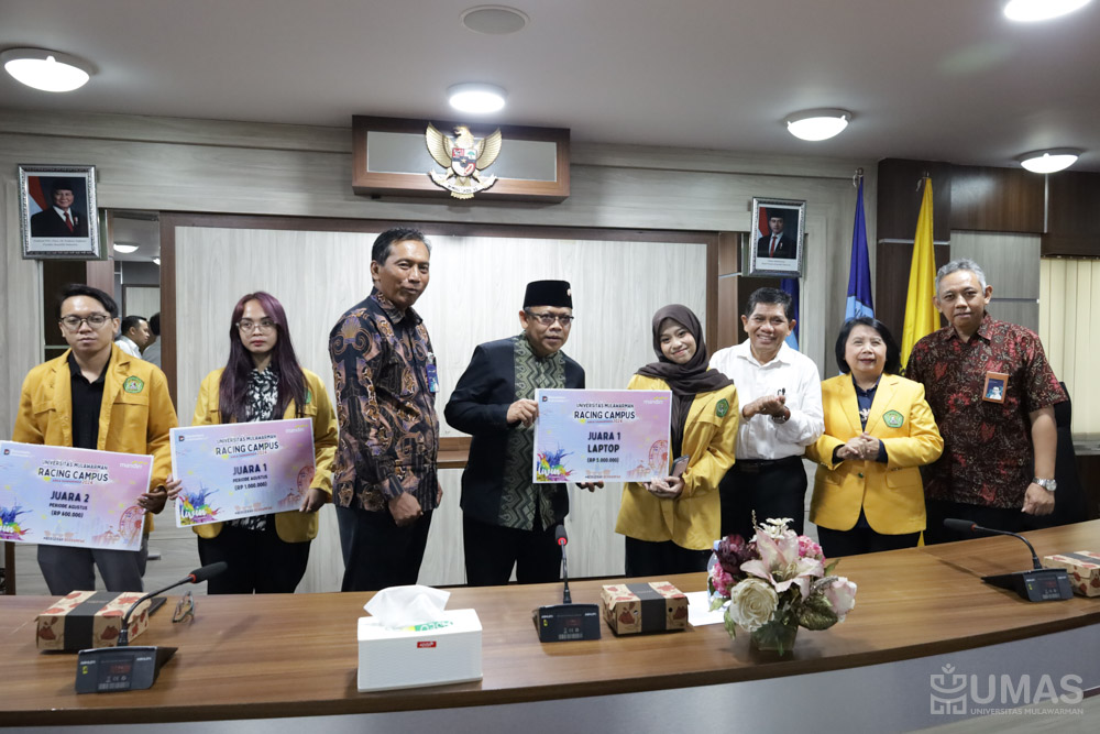 Penghargaan utama berupa sebuah laptop diserahkan secara simbolis melalui sebuah giant cheque oleh Rektor UNMUL, Prof. Dr. Ir. H. Abdunnur, M.Si., IPU., ASEAN Eng., kepada Mutiara Tasya Azizah sebagai pemenang utama. Kegiatan ini dilaksanakan di Ruang Rapat I Lantai Tiga Rektorat UNMUL, Senin (21/7/2025).
