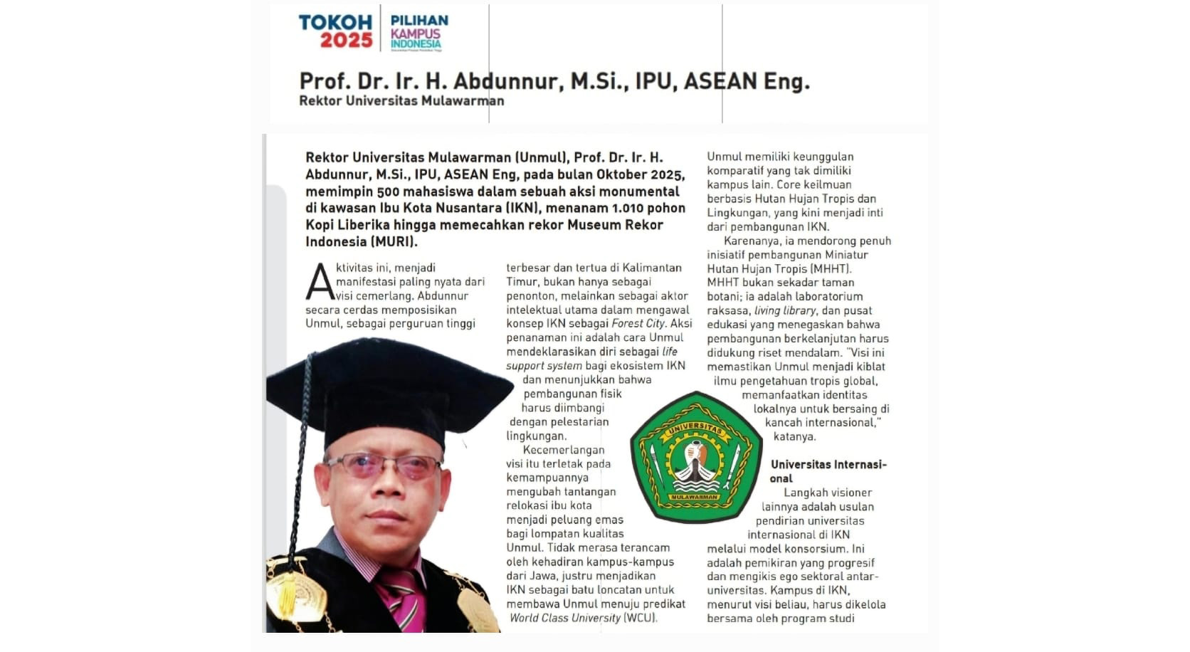 Sivitas Akademika Universitas Mulawarman (UNMUL) patut berbangga, Rektor UNMUL, Prof. Dr. Ir. H. Abdunnur, M.Si., IPU., ASEAN Eng., telah dinobatkan sebagai salah satu dari "25 Tokoh Pilihan Kampus Indonesia Tahun 2025" oleh Majalah Kampus Indonesia. Apresiasi bergengsi ini diberikan dalam edisi khusus November 2025, sebagai pengakuan atas peran dan pengaruh beliau yang signifikan dalam meningkatkan mutu dan peran pendidikan tinggi di Indonesia.