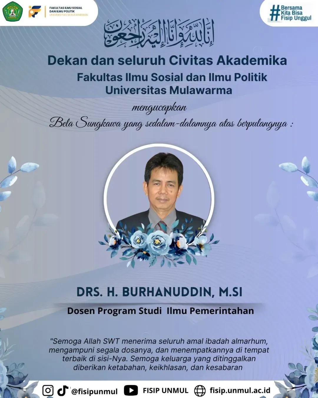 Dekan dan seluruh Civitas Akademika Fakultas Ilmu Sosial dan Ilmu Politik Universitas Mulawarman mengucapkan turut berduka cita yang sedalam-dalamnya atas Wafatnya Dosen Program Studi Ilmu Pemerintahan