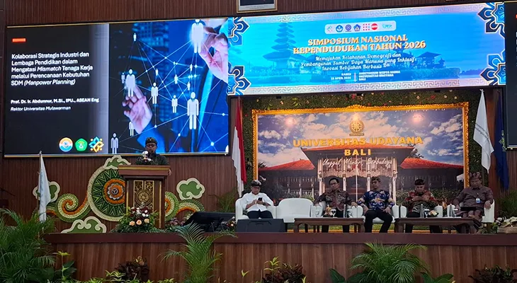 Rektor Universitas Mulawarman (UNMUL), Prof. Dr. Ir. H. Abdunnur, M.Si., IPU., ASEAN Eng., menjadi pembicara utama dalam Simposium Nasional Kependudukan tahun 2026 yang diselenggarakan di Auditorium Universitas Udayana, Bali, Kamis (23/4/2026).
