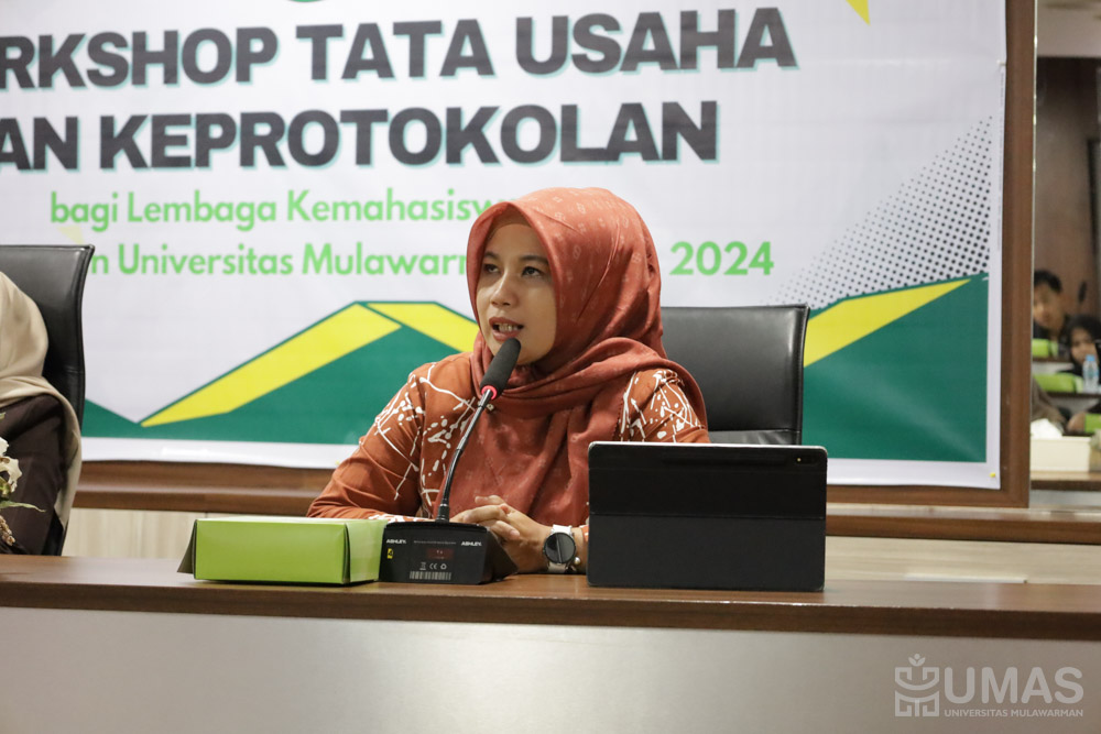 Menghadirkan dua narasumber, yakni Siti Khodijah, S.E., M.Si. selaku Kabag Keprotokolan Setda Kaltim untuk materi keprotokolan yang meliputi tata cara pelaksanaan acara resmi, etika keprotokolan, dan manajemen acara formal serta Paijan, S.Kom., M.Si., selaku Koordinator Umum Unmul untuk materi tata usaha yang meliputi penyusunan laporan administrasi, pengelolaan arsip, dan teknik komunikasi resmi.