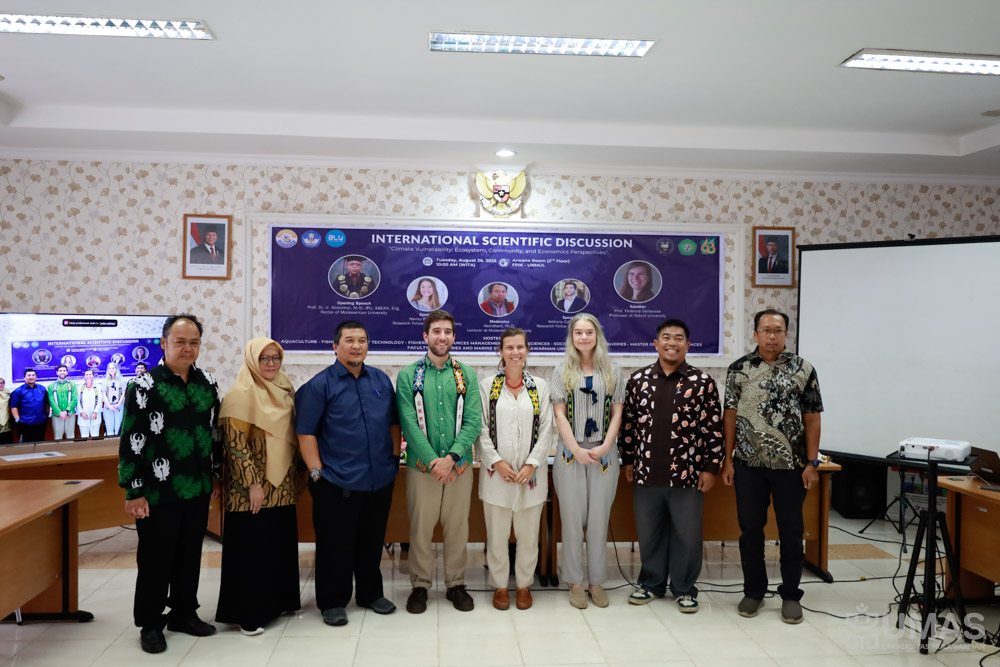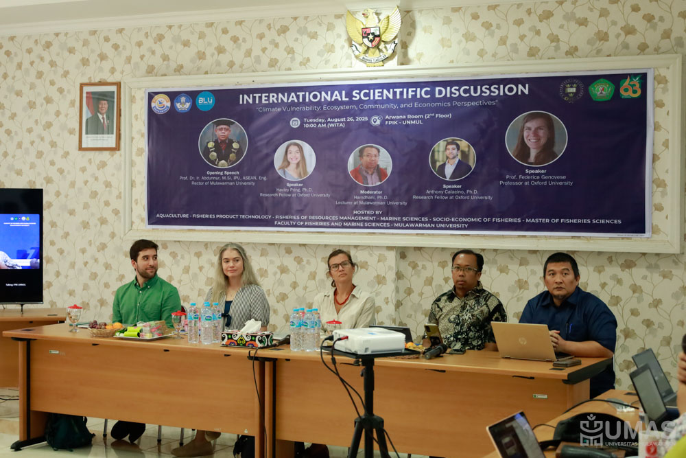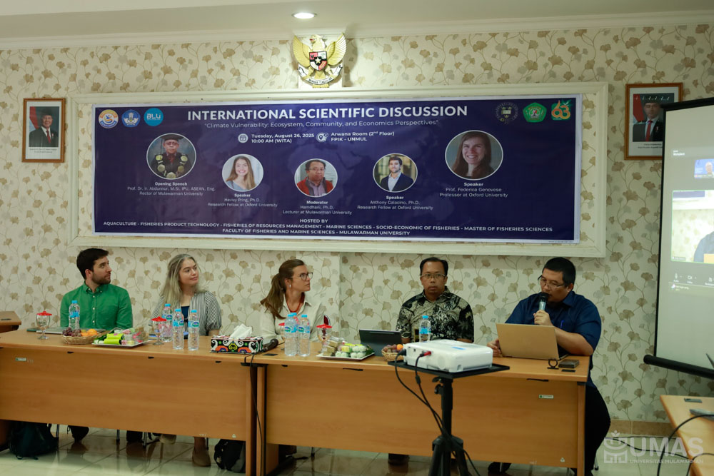 Fakultas Perikanan dan Ilmu Kelautan Universitas Mulawarman (FPIK UNMUL) menggelar Scientific Discussion on Climate Vulnerability bersama tim peneliti dari University of Oxford, United Kingdom, pada Selasa (26/8/2025) di Ruang Arwana, FPIK UNMUL.
